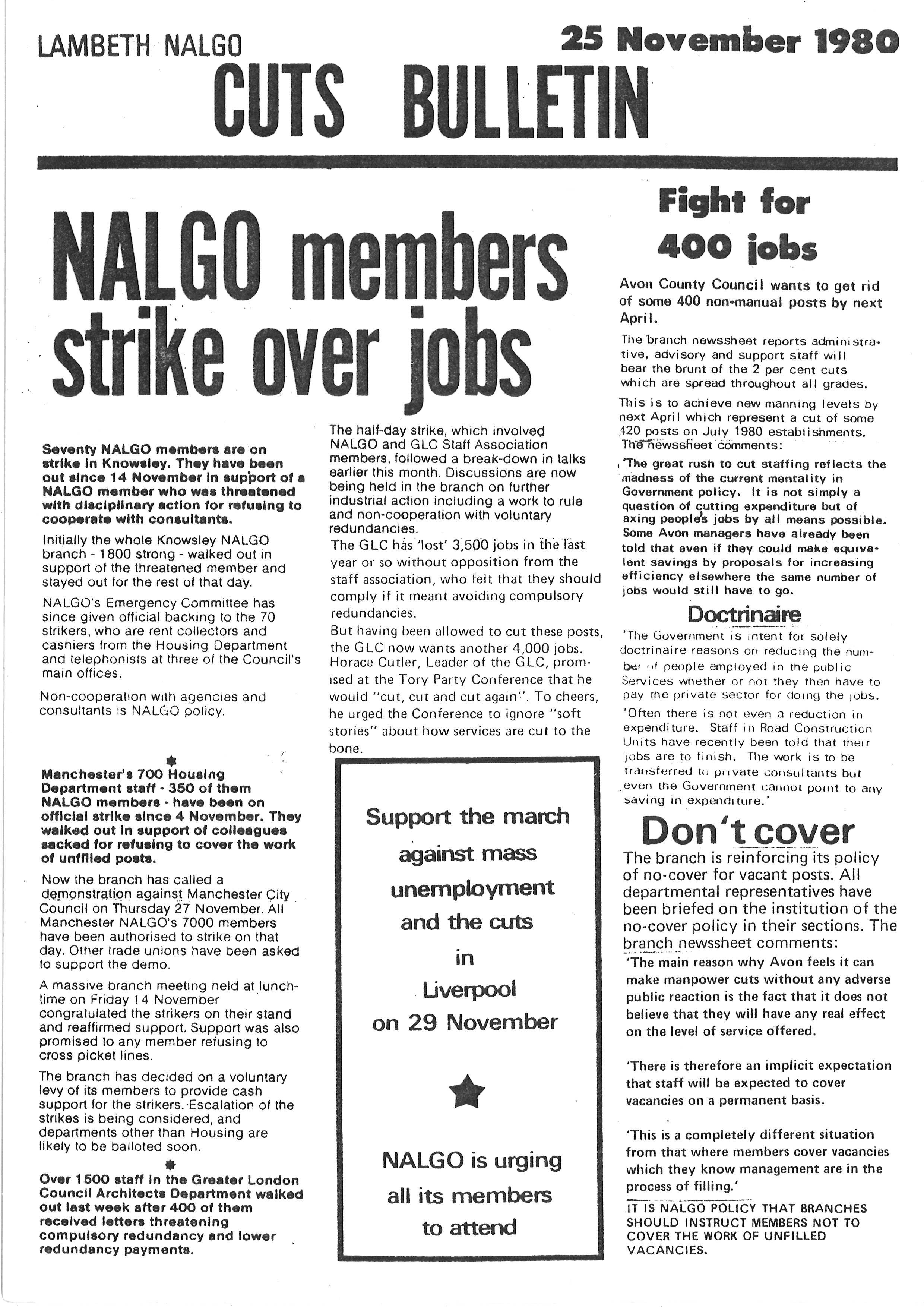 During a particularly frantic period of anti cuts activity in the early 1980s, Lambeth NALGO produced a series of anti cuts bulletins to mobilise members for action against the Thatcher government’s austerity agenda in her first term.
