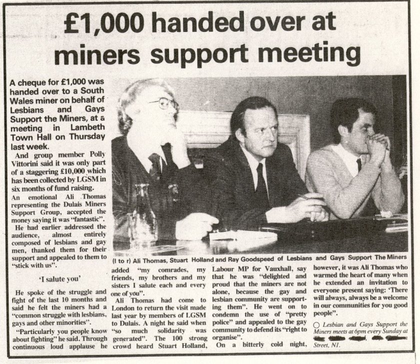 “Look at me in my dapper 1980s style chairing a very successful LGSM public meeting in Lambeth Town Hall in January 1985, with Stuart Holland, the left Labour MP for Vauxhall, and Ali Thomas, a miner from Dulais. I said when introducing the meeting – and I absolutely meant it – that I had never been so proud to be gay or so proud to be working class as I was at that time. Solidarity!”