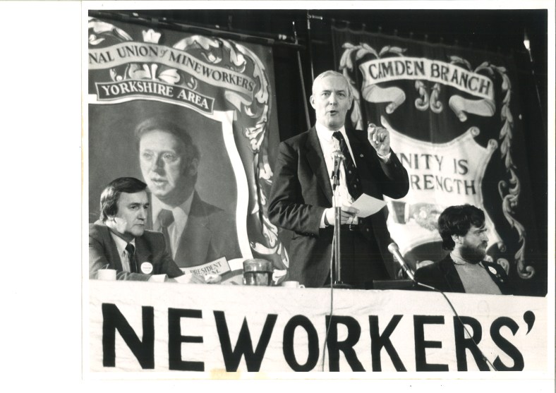 “Look at me in my dapper 1980s style chairing a very successful LGSM public meeting in Lambeth Town Hall in January 1985, with Stuart Holland, the left Labour MP for Vauxhall, and Ali Thomas, a miner from Dulais. I said when introducing the meeting – and I absolutely meant it – that I had never been so proud to be gay or so proud to be working class as I was at that time. Solidarity!”